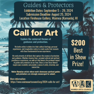 The Waimea Arts Council invites island artists to submit artwork that explores the universal themes of guidance and protection. We seek works that delve into cultural heritage, personal experiences and imaginative realms to create works that resonate with these fundamental human experiences. Whether you draw from personal experience or spiritual practices, we seek art that honors the profound ... Read more