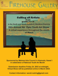 The Waimea Arts Council announces a call for young artists in North Hawai`i for its 39th Annual Nā `Ōpio Youth Art Show. This show coincides with National Youth Art Month which falls in March. Young artists in grades 6 through 12 from schools and homeschooled students in the North and South and Hāmākua districts are invited to submit their original works of art for this year’s show. This ... Read more