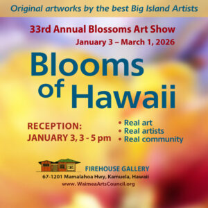 33rd Annual Blossoms Art Show January 3 – March 1, 2026 This captivating exhibition brings together the exquisite floral artistry of Big Island creators. This show highlights Hawaii’s unique and vibrant flowers, beautifully rendered in various mediums. Witness the artistic interpretations of blossoms that thrive in the island’s diverse environments and experience the beauty of Hawaii’s flora ... Read more