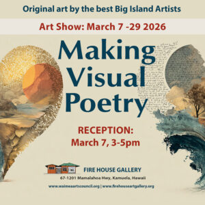 Experience how Hawai’i island artists explore the relationship between image and word in our members’ exhibit: Making Visual Poetry. Come meet artists at the opening reception for Making Visual Poetry on Saturday, December 7 from 3-5 pm, with light pupus and punch. The Firehouse Gallery is located at the intersection of highways 190 and 19 and is regularly open from Thursday – Sunday 11-3 ... Read more