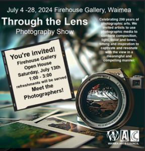 The Waimea Arts Council is excited to present Through the Lens, a photography exhibit celebrating 200 years of photographic arts. Our island artists have captured stunning images from around the world. Allow the art to take you from Alaska to Antarctica, with stops on the Danube, New Zealand and of course our beloved Hawai'i. Join us for refreshments at the Open House reception on Saturday ... Read more