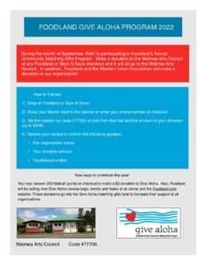 During the month of September, Waimea Arts Council is participating in Foodland's Annual Community Matching Gifts Program. Make a donation to the Waimea Arts Council at any Foodland or Sack N Save checkout ad it will all go to the Waimea Arts Council. In addition, Foodland and the Western Union Foundation will make a donation to our non-profit organization! How to Donate: Shop at ... Read more
