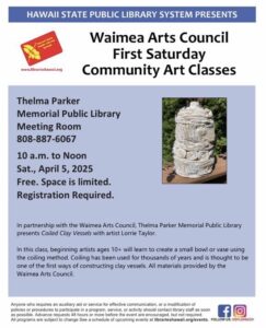 The Waimea Arts Council and Thelma Parker Memorial Public Library are offering a community art class on Coiled Clay Vessels. Artist Lorrie Taylor hosts the next session on Saturday April 5 from 10 am - noon in the Thelma Parker Memorial public library meeting room. In this class, beginning artists ages 10+ will learn how to create a small bowl or vase using the coiling method. Coiling has been ... Read more