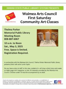 Do you have a story to tell? Join us at Zines! a community art class hosted jointly by the Waimea Arts Council and Thelma Parker Memorial Public Library. In this class young artists 6+ will draw a short story and create an eight page mini-magazine or zine. All materials will be provided by the Waimea Arts Council. Children under 10 must be accompanied by an adult. Artist Lorrie Taylor ... Read more
