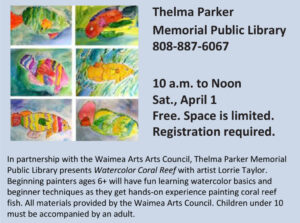 Thelma Parker Memorial Library and the Waimea Arts Council are very excited to host free First Saturday Community Art Classes. The first class is Saturday, April 1 from 10am to noon at Thelma Parker Memorial Library in Waimea. Artist and WAC member Lorrie Taylor will launch this program with Watercolor Coral Reef. Beginning painters ages 6+ will have fun learning watercolor basics and beginner ... Read more