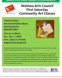 The Waimea Arts Council and Thelma Parker Memorial Public Library are offering First Saturday Community Art classes. Artist Lorrie Taylor hosts the next session on Saturday December 7 from 10 am - noon in the Kamuela's public library meeting room. The class will be open studio style with the intention of creating art as a special gift for someone. Watercolor and acrylic paint supplies will be ... Read more