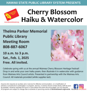 Celebrate spring with a free art and poetry class during the Waimea Cherry Blossom Festival Participants will write own haiku on the theme of cherry blossoms and illustrate it in watercolor with guidance from Waimea Arts Council artists. Drop in at the Thelma Parker Memorial Public Library Meeting Room on Saturday February 1 from 10 a.m. to 3 p.m. All are welcome to join. All materials ... Read more