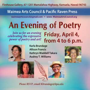 The Waimea Arts Council in collaboration with Pacific Raven Press is delighted to host an inspiring evening of poetry on Friday, April 4, from 4 to 6 p.m. This special event will feature local and visiting poets whose work resonates with contemporary art’s beauty and emotional depth. In the intimate gallery space, attendees will experience a dynamic fusion of visual and literary expression. The ... Read more