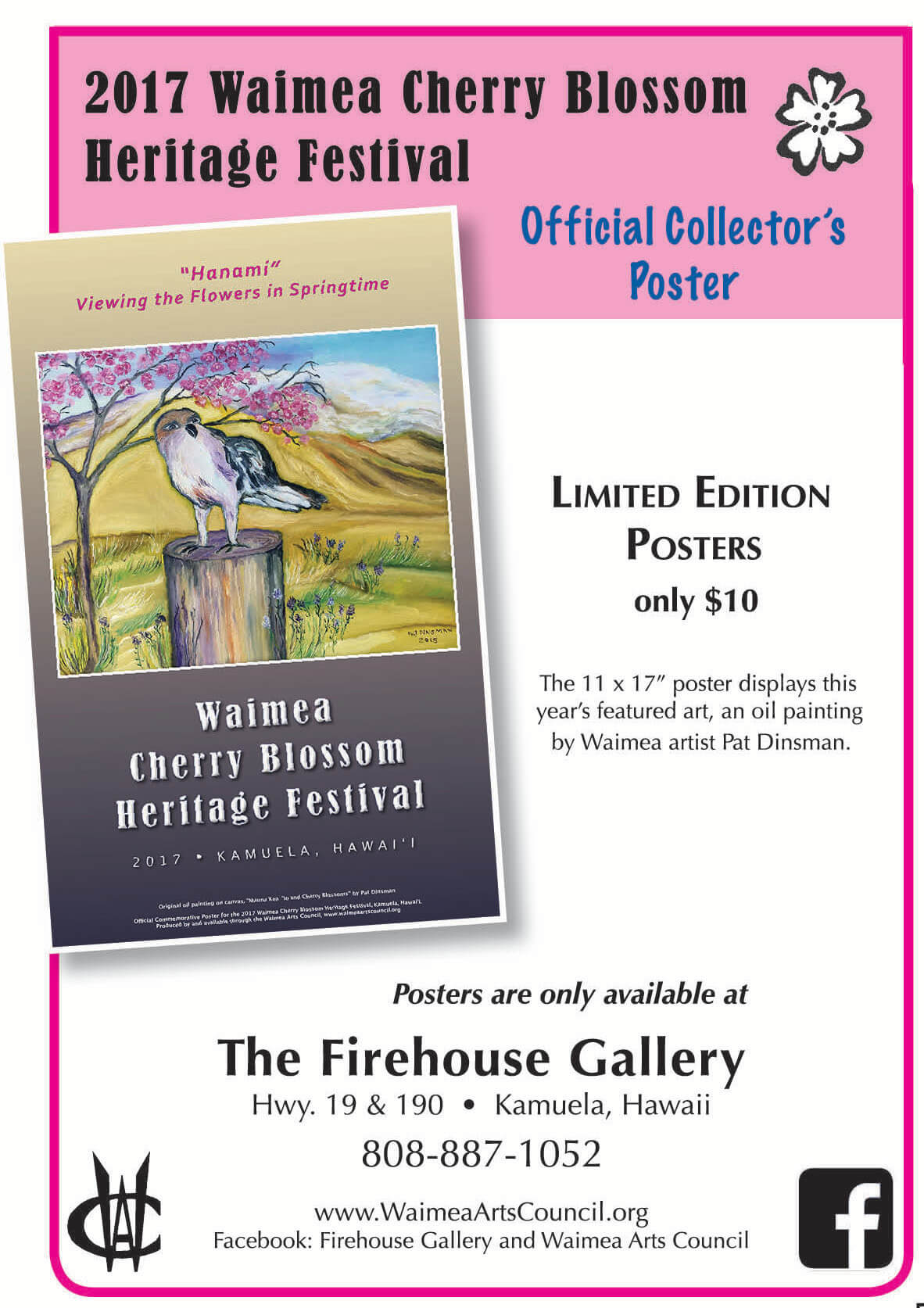 The Waimea Arts Council is sponsoring the “24th Annual Cherry Blossom Art Exhibition” at it’s Firehouse Gallery . This annual show features original art by the artist members of the Waimea Arts Council and will also include artwork based on places or events reminiscent of Waimea. The exhibition will be on display during the entire month of February. Artists will have originals and prints available for sale. They will be donating a percentage of all sales to the arts council to fund various community educational programs.