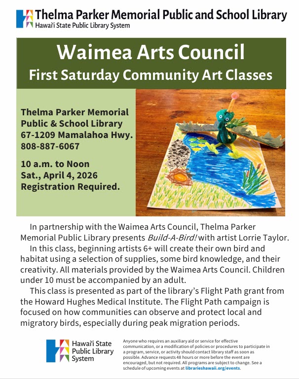 In partnership with the Waimea Arts Council, Thelma Parker Memorial Public Library presents Build-A-Bird! with artist Lorrie Taylor on April 4 from 10 am to noon in the library.