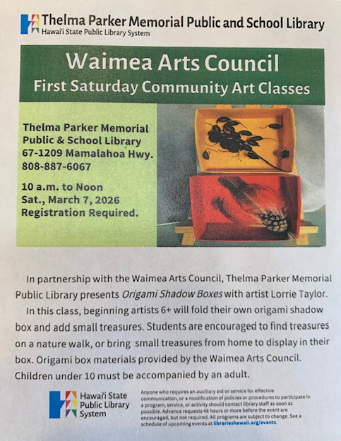 The Waimea Arts Council and Thelma Parker Memorial Public Library are offering a community art class on Saturday March 7 called Origami Shadow Boxes. Artist Lorrie Taylor hosts the session on Saturday March 7 from 10 am – noon in the Thelma Parker Memorial public library meeting room.