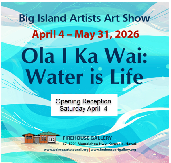 The Waimea Arts Council presents an exciting new show at the historic Firehouse Art Gallery. Ola I Ka Wai (Water is Life) displays vibrant original art interpreting the essential and spiritual connection between wai (water) and life in Hawai’i. Through diverse media and perspectives the show honors water as both a precious resource and a symbol of renewal.